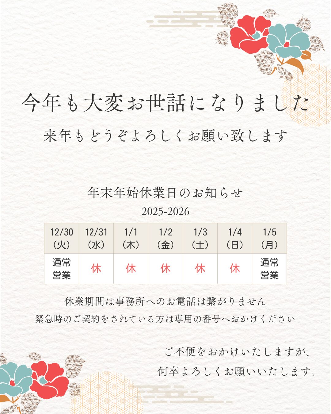 本年も大変お世話になりました。 本年もたくさんのご縁に支えられ、無事一年を終えることができました。 誠に勝手ながら、下記期間は年末年始休業とさせていただきます。 【年末年始休業】12月31日(水)~1月4日(日) 休業期